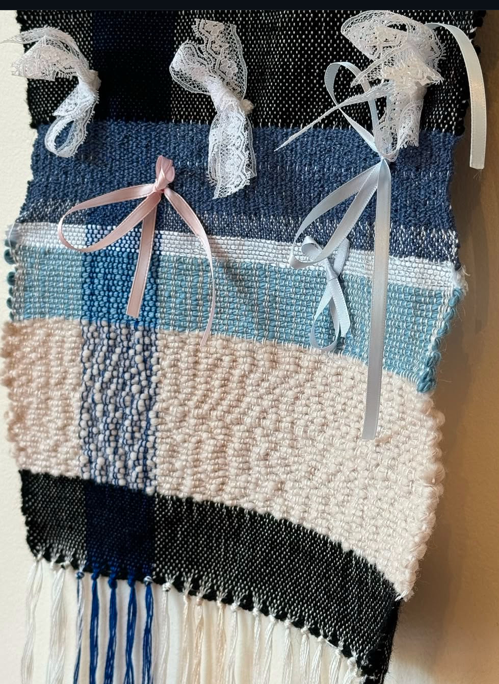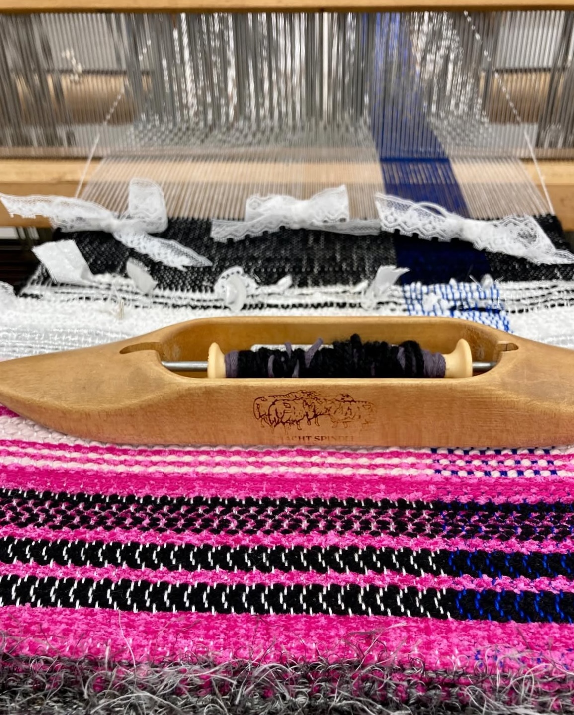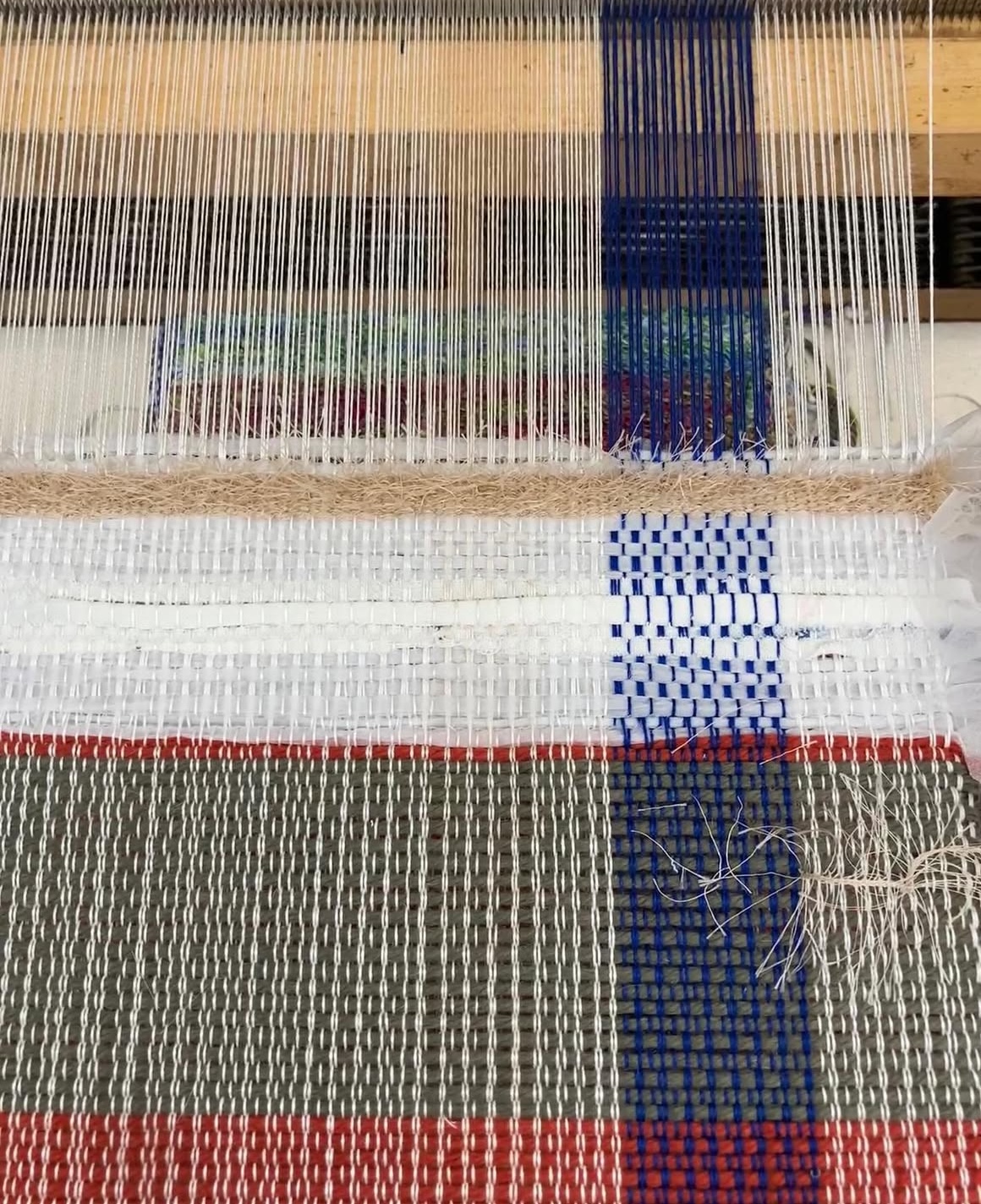 Students were taught to weave on the multi-harness floor loom, including loom setup, weave drafting, and an introduction to basic and complex woven cloth constructions. Additional studio exploration and projects were undertaken using off-loom weaving techniques such as rigid heddle weaving, stick weaving, basketry, macramé, and netting, as well as a collaborative weaving project focused on sustainability. The work of traditional and contemporary weavers, fiber artists, and designers was discussed.